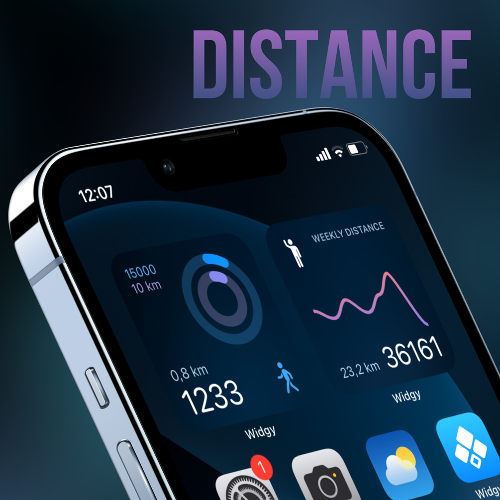 The pack has two small widgets. The first with two Ring Charts, which have a daily goal of 10 km and 15,000 steps, and running indicators. The second widget with a weekly scale about the distance traveled.